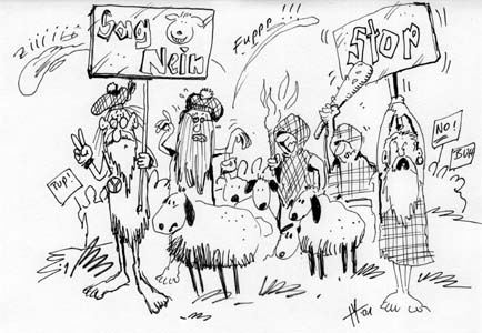 Aber es gab auch andere Probleme: Die neue Squeeze 'n Stretch-Technik rief auch frühe Tierschützer auf den Plan. Am Rande von Bag-Konzerten und Competitions demonstrierten zum Beispiel SheepPeace-Mitglieder für die Rechte der Schafe und gegen die "brutale Streckerei"...