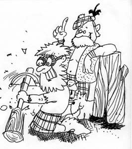 MacBag, Sohn von MacBag, hatte schließlich den rettenden Einfall: Er häutete ein gerade ausgespieltes Instrument und band das Stone-Reed und - eine Blowpipe ein! Das Resultat war verblüffend: Die Grundform des heute bekannten Dudelsackes war endlich gefunden! Die Schafpreise stürzten, die Preise für Schaffleisch hingegen stiegen und brachten MacDoof an den Rand des Ruins. Nun ging es Schlag auf Schlag: Woody MacBag, Sohn von Blow MacBag, hatte eine ausgesprochener Vorliebe für "weiche" Dinge wie z.B. Holz. Zwar ging er bei MacStone als Reedmaker in die Lehre, verlegte sich aber danach auf die Produktion hölzerner (!) Reeds.