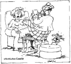 Dass mit dem "under the kilt" sogar erfolgreich Schach gespielt werden kann, belegt diese auf einer Schachseite gefundene Abbildung. Unter Gambit (wohl nach dem italienischen dare il gambetto ein Bein stellen) wird im Schachspiel eine Eröffnungsart beschrieben, die zwecks Angriff Bauern oder Figuren preisgibt. Das schottische Gambit gibt zweifelsohne etwas preis und sorgt so für Überraschung und Verwirrung des Gegners. Es ist daher eine in Schachkreisen gefürchtete Eröffnungsvariante...