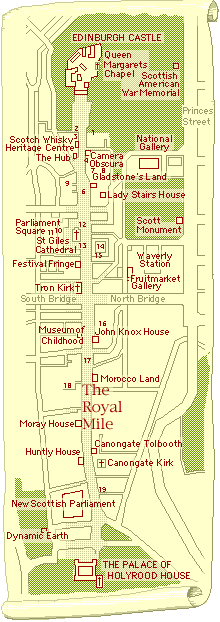 Lediglich zum Osten neigt sich der Berg gemächlich bis zum Holyrood House, dem Palast Mary Stuarts und heutigen Sitz der englischen Royals, wenn sie sich in Edinburgh aufhalten. Die Straße zwischen Castle und Palace ist die Royal Mile. Hier reiht sich Laden an Laden, und historische Sehenswürdigkeiten sind aufgereiht wie Perlen an einer Schnur. Durch kleine Gassen kann man dem Trubel dieser Straße in Hinterhöfe entfliehen, und durch ein Gewirr von Durchgängen, Treppen und Höfen kann man im Norden wie im Süden zum Fuße des Berges gelangen.
